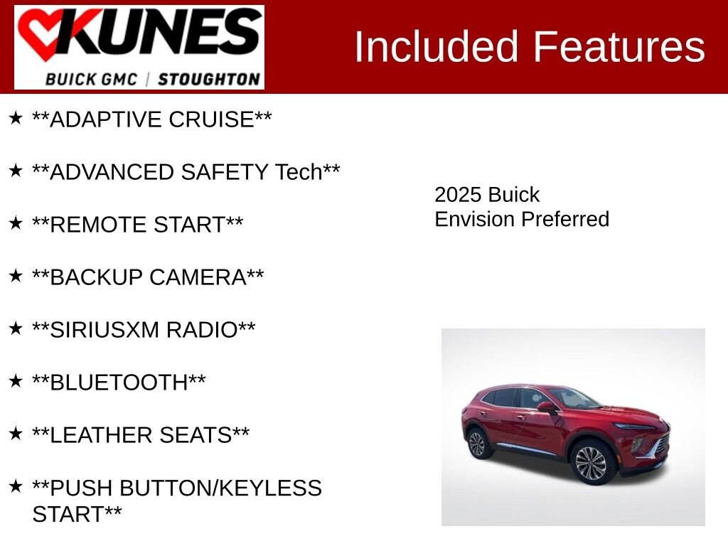 2025 Buick Envision Preferred 2.0L Turbocharged **ADAPTIVE CRUISE**, **ADVANCED SAFETY Tech**, **REMOTE START**, **BACKUP CAMERA**, **SIRIUSXM RADIO**, **BLUETOOTH**, **LEATHER SEATS**, **PUSH BUTTON/KEYLESS START**, **FACTORY 3 YEAR/36,000 MILE COMPREHENSIVE WARRANTY REMAINING**, **FACTORY 5 YEAR/60,000 MILE POWERTRAIN/ENGINE WARRANTY REMAINING**, Bose Premium 9-Speaker Audio System Feature. 22/28 City/Highway MPG