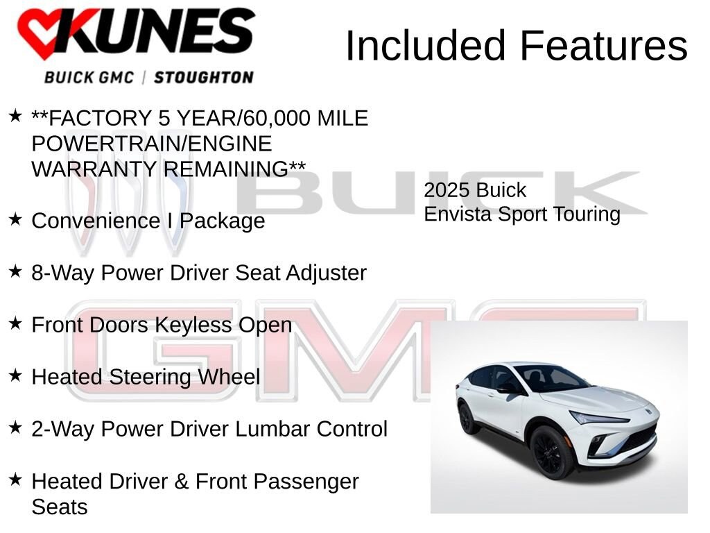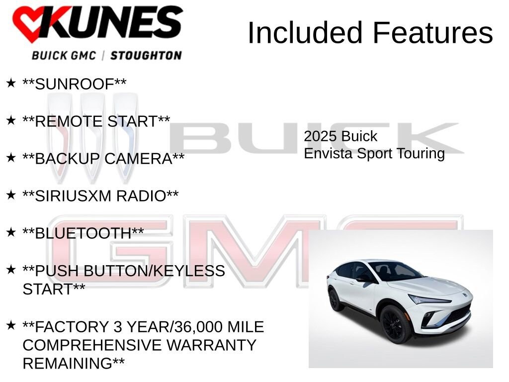 2025 Buick Envista Sport Touring ECOTEC 1.2L Turbo **SUNROOF**, **REMOTE START**, **BACKUP CAMERA**, **SIRIUSXM RADIO**, **BLUETOOTH**, **PUSH BUTTON/KEYLESS START**, **FACTORY 3 YEAR/36,000 MILE COMPREHENSIVE WARRANTY REMAINING**, **FACTORY 5 YEAR/60,000 MILE POWERTRAIN/ENGINE WARRANTY REMAINING**, 2-Way Power Driver Lumbar Control, 8-Way Power Driver Seat Adjuster, Convenience I Package, Front Doors Keyless Open, Heated Driver & Front Passenger Seats, Heated Steering Wheel. 28/32 City/Highway MPG
