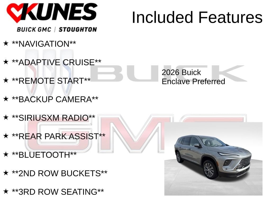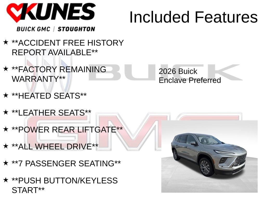 2026 Buick Enclave Preferred 2.5L DOHC **NAVIGATION**, **ADAPTIVE CRUISE**, **REMOTE START**, **BACKUP CAMERA**, **SIRIUSXM RADIO**, **REAR PARK ASSIST**, **BLUETOOTH**, **2ND ROW BUCKETS**, **3RD ROW SEATING**, **ACCIDENT FREE HISTORY REPORT AVAILABLE**, **FACTORY REMAINING WARRANTY**, **HEATED SEATS**, **LEATHER SEATS**, **POWER REAR LIFTGATE**, **ALL WHEEL DRIVE**, **7 PASSENGER SEATING**, **PUSH BUTTON/KEYLESS START**, **FACTORY 3 YEAR/36,000 MILE COMPREHENSIVE WARRANTY REMAINING**, **FACTORY 5 YEAR/60,000 MILE POWERTRAIN/ENGINE WARRANTY REMAINING**, AWD, 110-Volt Power Outlet, 1st and 2nd Row All-Weather Floor Liners, 2nd Row 1-Touch Flat Folding Seat, 3rd Row 60/40 Power Split-Folding Bench Seat, 3rd Row All-Weather Floor Liner, Floor Liner Package, Front Mounting License Plate Bracket Package, Head-Up Display, Heated Wiper Park, Inside Rearview Auo-Dimming Rear Camera Mirror, Integrated Cargo Liner, Memory Settings, Power Package, Preferred Equipment Group 1SD, Universal Home Remote.