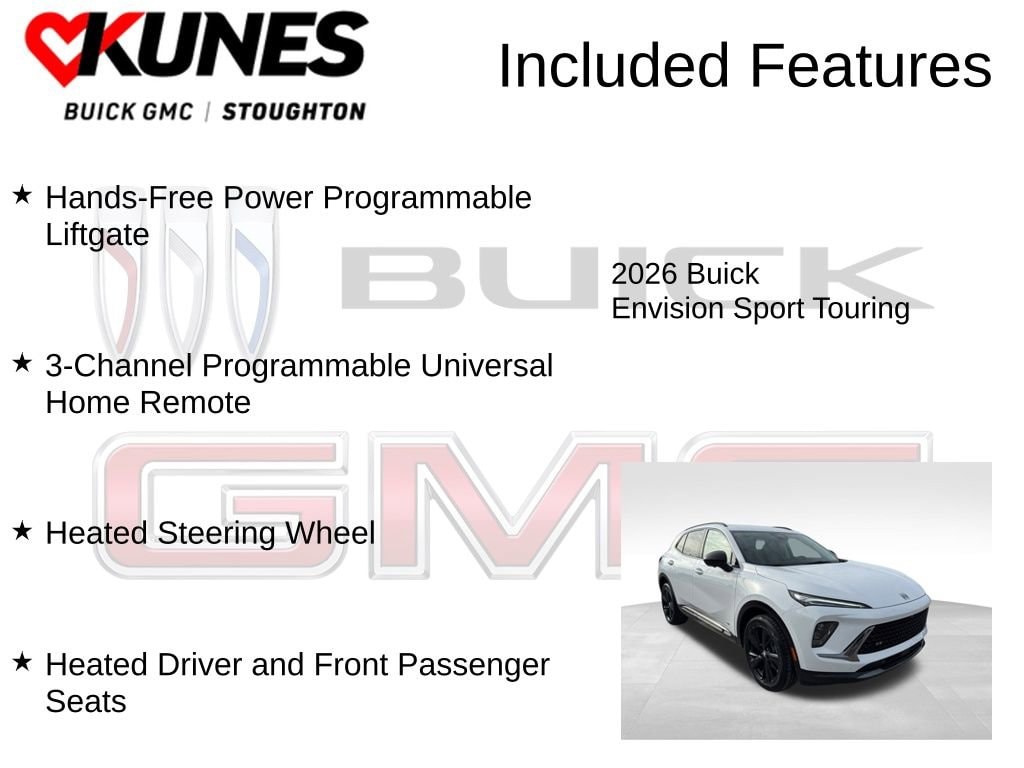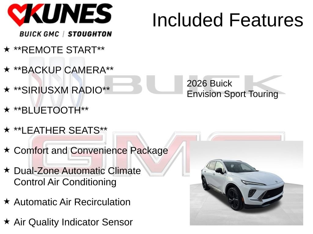 2026 Buick Envision Sport Touring 2.0L Turbocharged **REMOTE START**, **BACKUP CAMERA**, **SIRIUSXM RADIO**, **BLUETOOTH**, **LEATHER SEATS**, 3-Channel Programmable Universal Home Remote, Air Quality Indicator Sensor, Automatic Air Recirculation, Comfort and Convenience Package, Dual-Zone Automatic Climate Control Air Conditioning, Hands-Free Power Programmable Liftgate, Heated Driver and Front Passenger Seats, Heated Steering Wheel. 22/28 City/Highway MPG