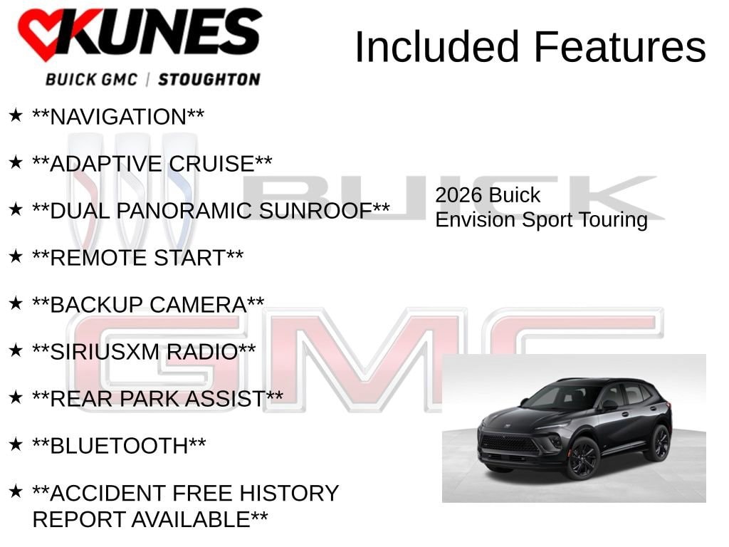 2026 Buick Envision Sport Touring 2.0L Turbocharged **NAVIGATION**, **ADAPTIVE CRUISE**, **DUAL PANORAMIC SUNROOF**, **REMOTE START**, **BACKUP CAMERA**, **SIRIUSXM RADIO**, **REAR PARK ASSIST**, **BLUETOOTH**, **ACCIDENT FREE HISTORY REPORT AVAILABLE**, **FACTORY REMAINING WARRANTY**, **HEATED SEATS**, **LEATHER SEATS**, **POWER REAR LIFTGATE**, **ALL WHEEL DRIVE**, **PUSH BUTTON/KEYLESS START**, **FACTORY 3 YEAR/36,000 MILE COMPREHENSIVE WARRANTY REMAINING**, **FACTORY 5 YEAR/60,000 MILE POWERTRAIN/ENGINE WARRANTY REMAINING**, 3-Channel Programmable Universal Home Remote, Air Quality Indicator Sensor, Automatic Air Recirculation, Comfort and Convenience Package, Dual-Zone Automatic Climate Control Air Conditioning, Hands-Free Power Programmable Liftgate, Heated Driver and Front Passenger Seats, Heated Steering Wheel. 22/28 City/Highway MPG