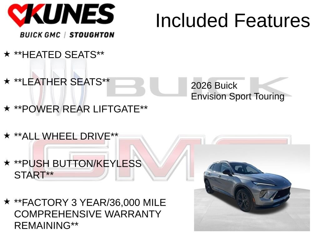 2026 Buick Envision Sport Touring 2.0L Turbocharged **NAVIGATION**, **ADAPTIVE CRUISE**, **REMOTE START**, **BACKUP CAMERA**, **SIRIUSXM RADIO**, **REAR PARK ASSIST**, **BLUETOOTH**, **ACCIDENT FREE HISTORY REPORT AVAILABLE**, **FACTORY REMAINING WARRANTY**, **HEATED SEATS**, **LEATHER SEATS**, **POWER REAR LIFTGATE**, **ALL WHEEL DRIVE**, **PUSH BUTTON/KEYLESS START**, **FACTORY 3 YEAR/36,000 MILE COMPREHENSIVE WARRANTY REMAINING**, **FACTORY 5 YEAR/60,000 MILE POWERTRAIN/ENGINE WARRANTY REMAINING**, 3-Channel Programmable Universal Home Remote, Air Quality Indicator Sensor, Automatic Air Recirculation, Comfort and Convenience Package, Dual-Zone Automatic Climate Control Air Conditioning, Hands-Free Power Programmable Liftgate, Heated Driver and Front Passenger Seats, Heated Steering Wheel. 22/28 City/Highway MPG