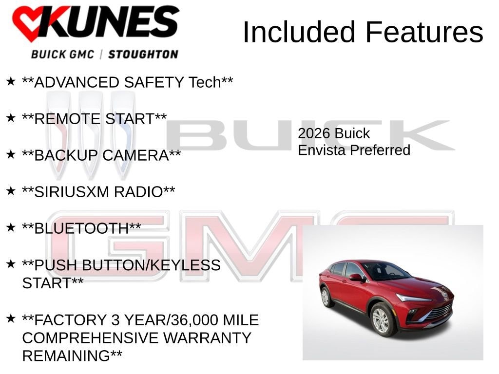 2026 Buick Envista Preferred ECOTEC 1.2L Turbo **ADVANCED SAFETY Tech**, **REMOTE START**, **BACKUP CAMERA**, **SIRIUSXM RADIO**, **BLUETOOTH**, **PUSH BUTTON/KEYLESS START**, **FACTORY 3 YEAR/36,000 MILE COMPREHENSIVE WARRANTY REMAINING**, **FACTORY 5 YEAR/60,000 MILE POWERTRAIN/ENGINE WARRANTY REMAINING**. 28/32 City/Highway MPG