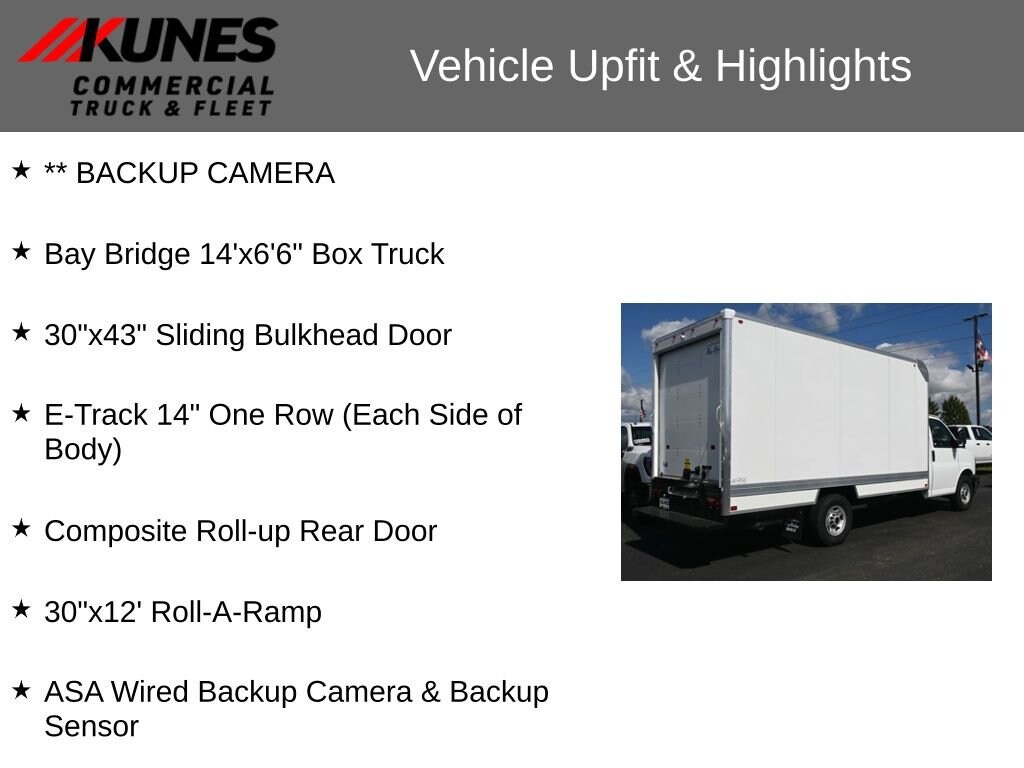 ** BACKUP CAMERA, Bay Bridge 14'x6'6 Box Truck, 30x43 Sliding Bulkhead Door, E-Track 14 One Row (Each Side of Body), Composite Roll-up Rear Door, 30x12' Roll-A-Ramp, ASA Wired Backup Camera & Backup Sensor.