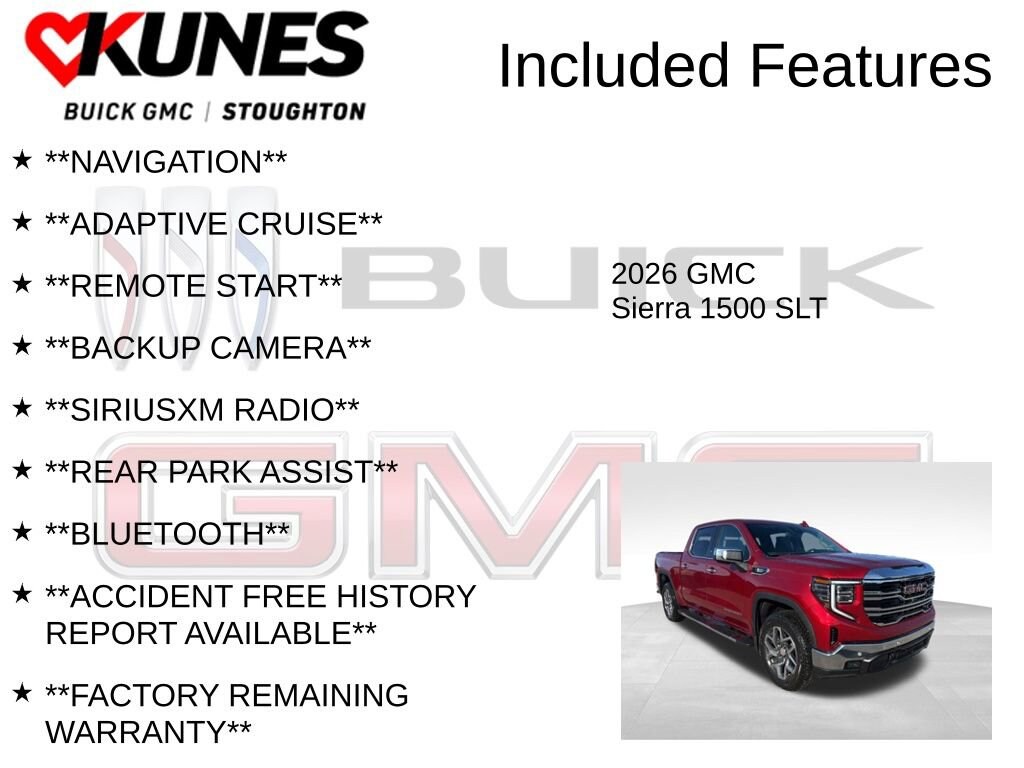 Also included with every new vehicle we sell: LIFETIME NO FEAR WARRANTY, FIRST OIL CHANGE, and AT HOME COURTESY DELIVERY! Call us for full details! We pride ourselves on honesty and integrity, but please note that mistakes or misprints due to human error are possible. Find out why our dealerships have won DealerRater.com DEALER OF THE YEAR a whopping 10 TIMES! Call, email, or live chat with one of our friendly sales professionals now to schedule your test drive! Prices shown do not include tax, title, registration and $599 service fees. Price includes: $1750 - Buick & GMC Consumer Cash Program. Exp. 03/02/2026 $500 - Buick GMC Bonus Cash. Exp. 03/02/2026 Price Includes: $2500 - Kunes Special Offer. Exp Exp. 03/02/2026