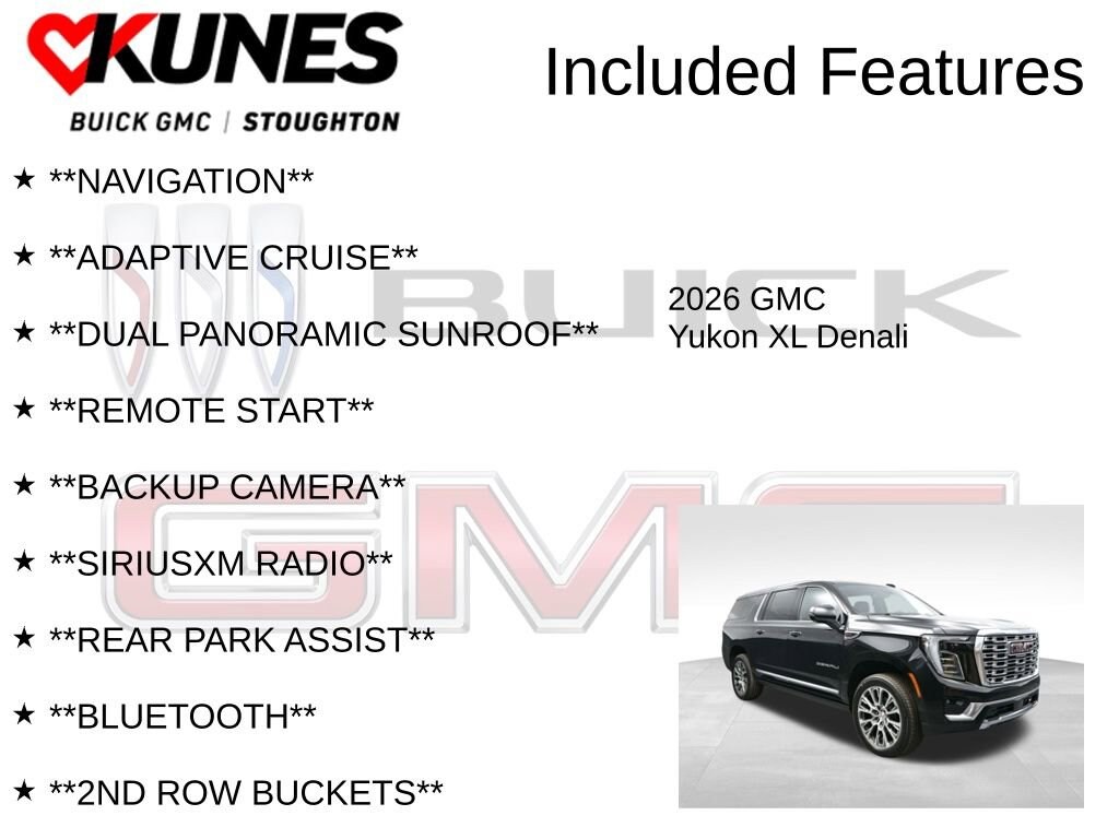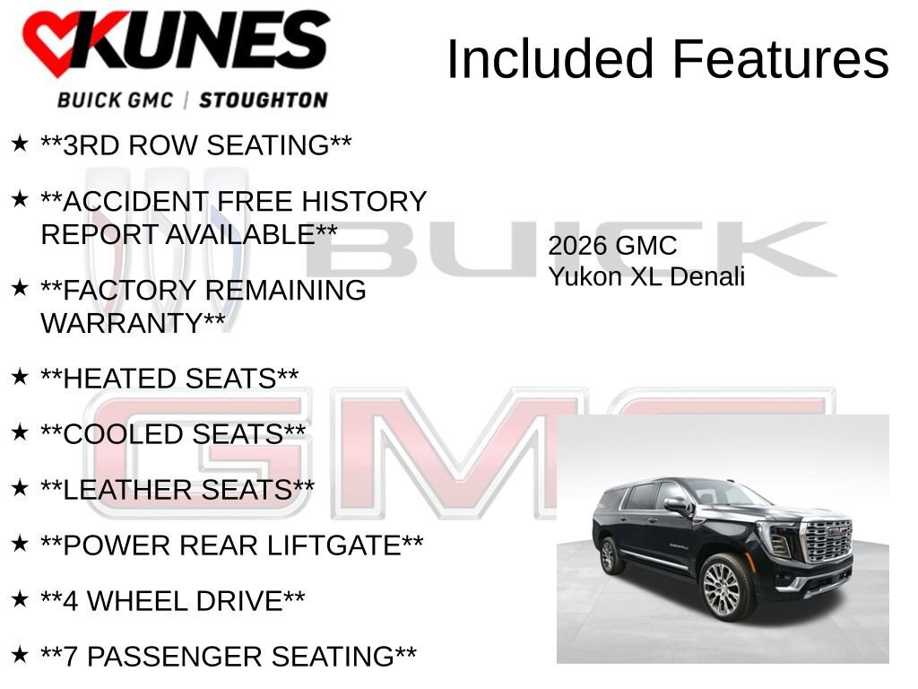 2026 GMC Yukon XL Denali EcoTec3 6.2L V8 **NAVIGATION**, **ADAPTIVE CRUISE**, **DUAL PANORAMIC SUNROOF**, **REMOTE START**, **BACKUP CAMERA**, **SIRIUSXM RADIO**, **REAR PARK ASSIST**, **BLUETOOTH**, **2ND ROW BUCKETS**, **3RD ROW SEATING**, **ACCIDENT FREE HISTORY REPORT AVAILABLE**, **FACTORY REMAINING WARRANTY**, **HEATED SEATS**, **COOLED SEATS**, **LEATHER SEATS**, **POWER REAR LIFTGATE**, **4 WHEEL DRIVE**, **7 PASSENGER SEATING**, **PUSH BUTTON/KEYLESS START**, **RUNNING BOARDS**, **FACTORY 3 YEAR/36,000 MILE COMPREHENSIVE WARRANTY REMAINING**, **FACTORY 5 YEAR/60,000 MILE POWERTRAIN/ENGINE WARRANTY REMAINING**, 4WD, 15 Diagonal Multi-Color Head-Up Display, 3 Years OnStar One, 3rd Row All-Weather Floor Liners, 4-Way Power Driver Lumbar Seat Adjuster, 4-Way Power Front Passenger Lumbar Seat Adjuster, All-Weather Cargo Mat, AutoSense Hands-Free Power Liftgate, Bright Front and Rear Door Sill Plates, Dual Exhaust System, Dual-Pane Panoramic Power Sunroof, First and Second Rows Premium Floor Liners, Floor Liner Package, Galvano Bodyside Moldings, License Plate Front Mounting Package, Magnetic Ride Control Suspension, Perforated Heated and Ventilated Driver and Front Passenger Seats, Power Release 2nd Row Bucket Seats, Power Tilt and Telescopic Steering Column, Power-Retractable Assist Steps, Preferred Equipment Group 5SA, Sun and Power Step Package, Wheels: 20 x 9 6-Spoke Polished Aluminum.