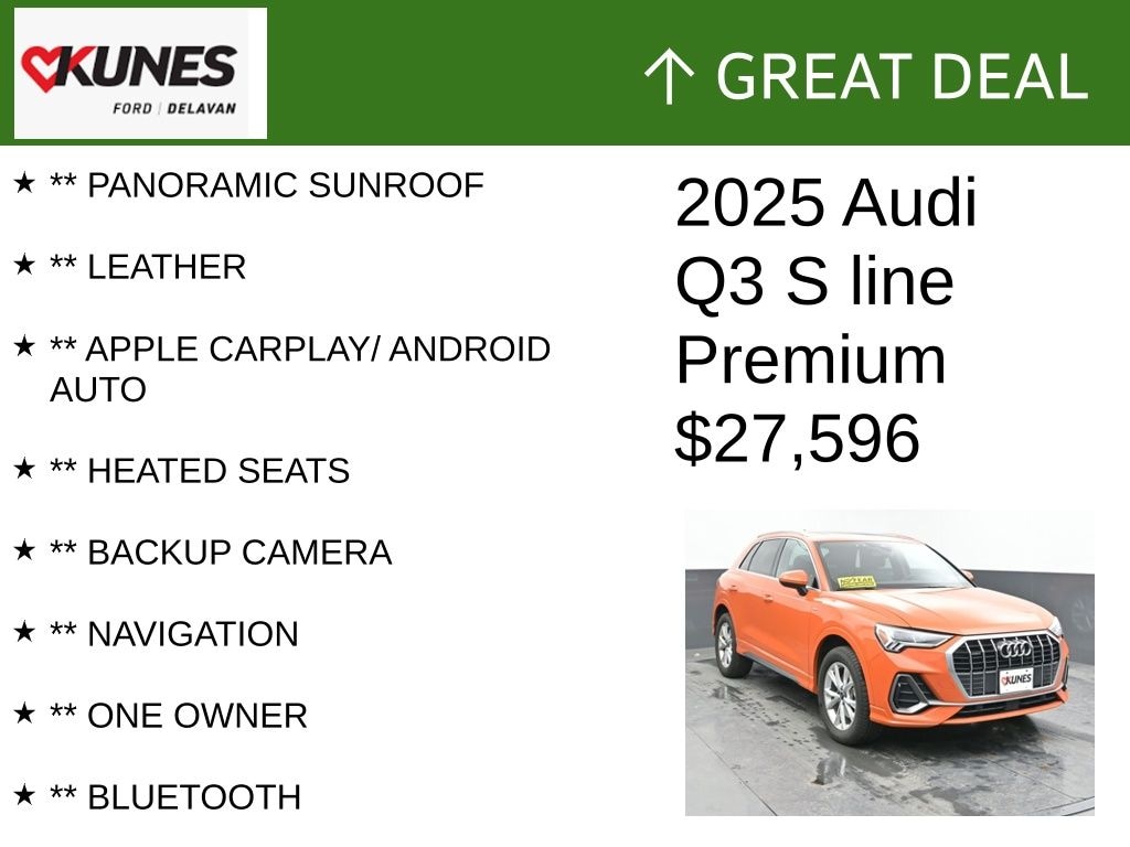 2025 Audi Q3 Premium S Line quattro 2.0L 4-Cylinder TFSI 8-Speed Automatic with Tiptronic quattro Clean CARFAX. CARFAX One-Owner. 20/28 City/Highway MPG
