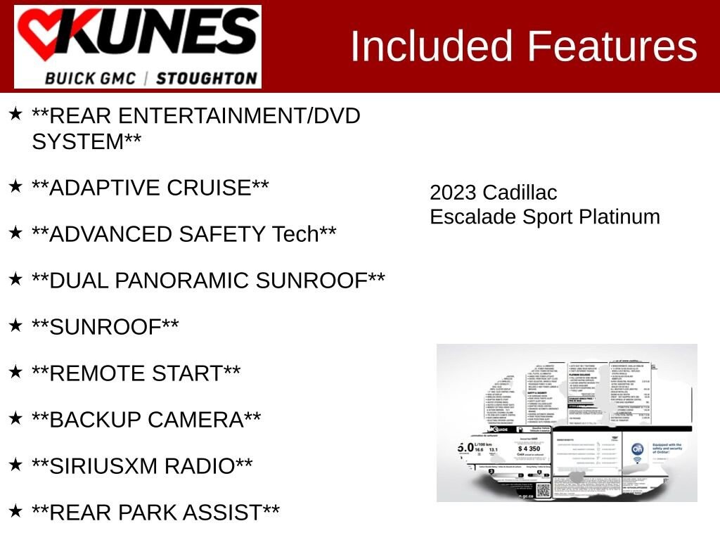 **REAR ENTERTAINMENT/DVD SYSTEM**, **ADAPTIVE CRUISE**, **ADVANCED SAFETY Tech**, **DUAL PANORAMIC SUNROOF**, **SUNROOF**, **REMOTE START**, **BACKUP CAMERA**, **SIRIUSXM RADIO**, **REAR PARK ASSIST**, **BLUETOOTH**, **2ND ROW BUCKETS**, **3RD ROW SEATING**, **ACCIDENT FREE HISTORY REPORT AVAILABLE**, **FACTORY REMAINING WARRANTY**, **HEATED SEATS**, **COOLED SEATS**, **LEATHER SEATS**, **POWER REAR LIFTGATE**, **4 WHEEL DRIVE**, **7 PASSENGER SEATING**, **PUSH BUTTON/KEYLESS START**, **RUNNING BOARDS**, **PREFFERED PACKAGE**, **LUXURY PACKAGE**, **FACTORY 5 YEAR/60,000 MILE POWERTRAIN/ENGINE WARRANTY REMAINING**, AWD, Whisper Beige w/Gideon Accents w/Full Semi-Aniline Leather Seat Trim, Air Ride Adaptive Suspension, Gloss Black Escalade Nameplate (LPO), Illuminating Front & Rear Sill Plates, Monochrome Cadillac Emblems (LPO), Onyx Package (LPO), Soft Closing Front & Rear Doors, Touring Package, Wheels: 22 12-Spoke Gloss Black Alloy (LPO), Wheels: 22 Interim (LPO). Odometer is 1482 miles below market average! Sport Platinum
