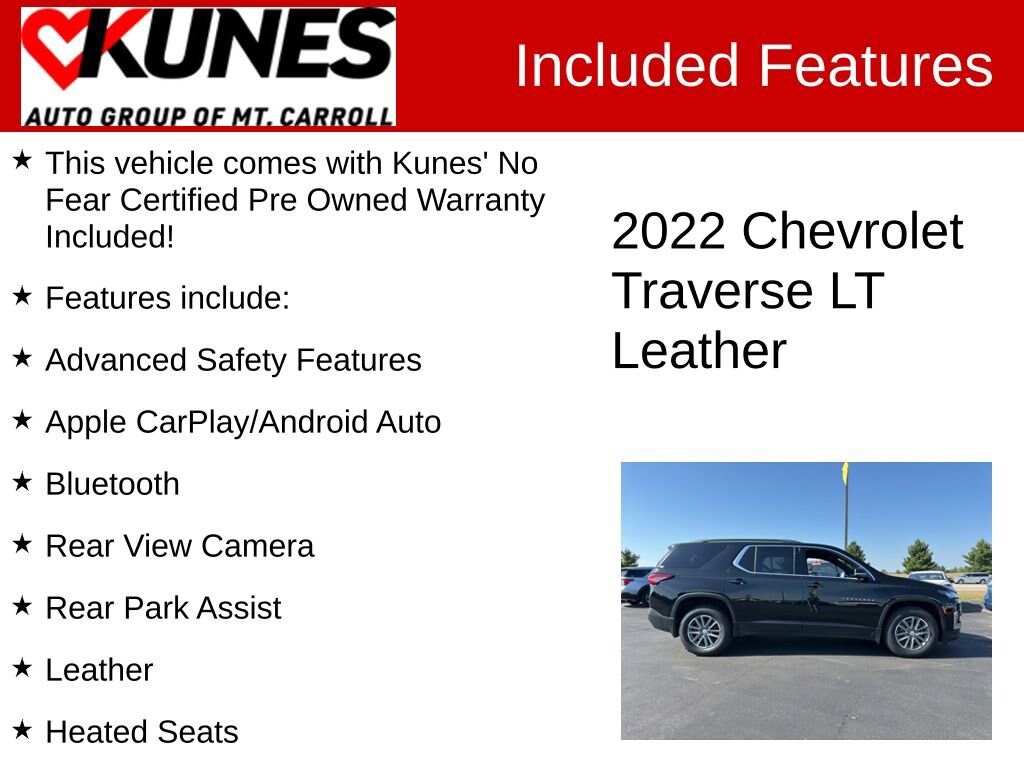 This vehicle comes with Kunes' No Fear Certified Pre Owned Warranty Included!, Features include:, Advanced Safety Features, Apple CarPlay/Android Auto, Bluetooth, Rear View Camera, Rear Park Assist, Leather, Heated Seats, 2nd Row Captain Chairs/Buckets, 3rd Row Seating, Keyless Entry, Keyless Ignition, Remote Start, Navigation/GPS/NAVI, Sirius/XM, Satellite Radio, MP3 player, Collision Avoidance, Tow Package, Power Lift Gate, Steering Wheel Controls, Traverse LT Leather, 4D Sport Utility, AWD, Mosaic Black Metallic, Black Leather, 6 Speakers, 6-Speaker Audio System Feature, 6-Way Power Front Passenger Seat, 8-Way Power Driver Seat Adjuster, Apple CarPlay/Android Auto, Delay-off headlights, Emergency communication system: OnStar Guidance, Exterior Parking Camera Rear, Four wheel independent suspension, Front License Plate Bracket Mounting Package, Front Passenger 2-Way Power Lumbar, Heated steering wheel, Panic alarm, Power windows, Preferred Equipment Group 3LT, Radio data system, Rear Park Assist w/Audible Warning, Remote keyless entry, SiriusXM w/360L, Speed-sensing steering, Steering wheel mounted audio controls, Trailering Equipment, Voltmeter.