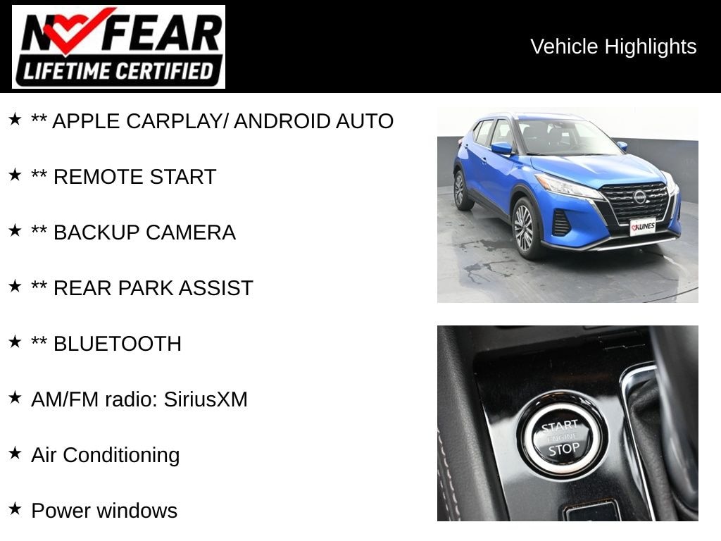 2024 Nissan Kicks SV 1.6L 4-Cylinder DOHC 16V CVT with Xtronic FWD Clean CARFAX. CARFAX One-Owner. 31/36 City/Highway MPG
